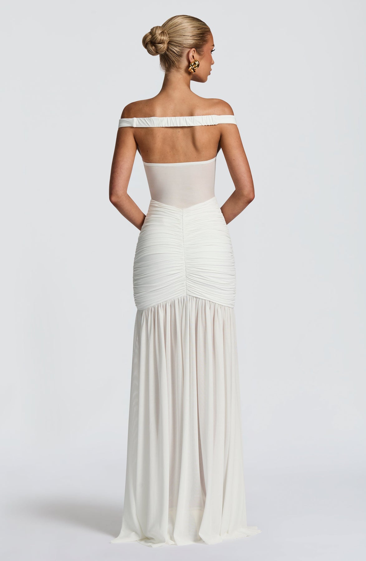 The Alaia Maxi Dress in ivory combines slinky jersey with sheer mesh, featuring a sweetheart bardot neckline, ruched hips, and a thigh-high split for elegant sophistication.