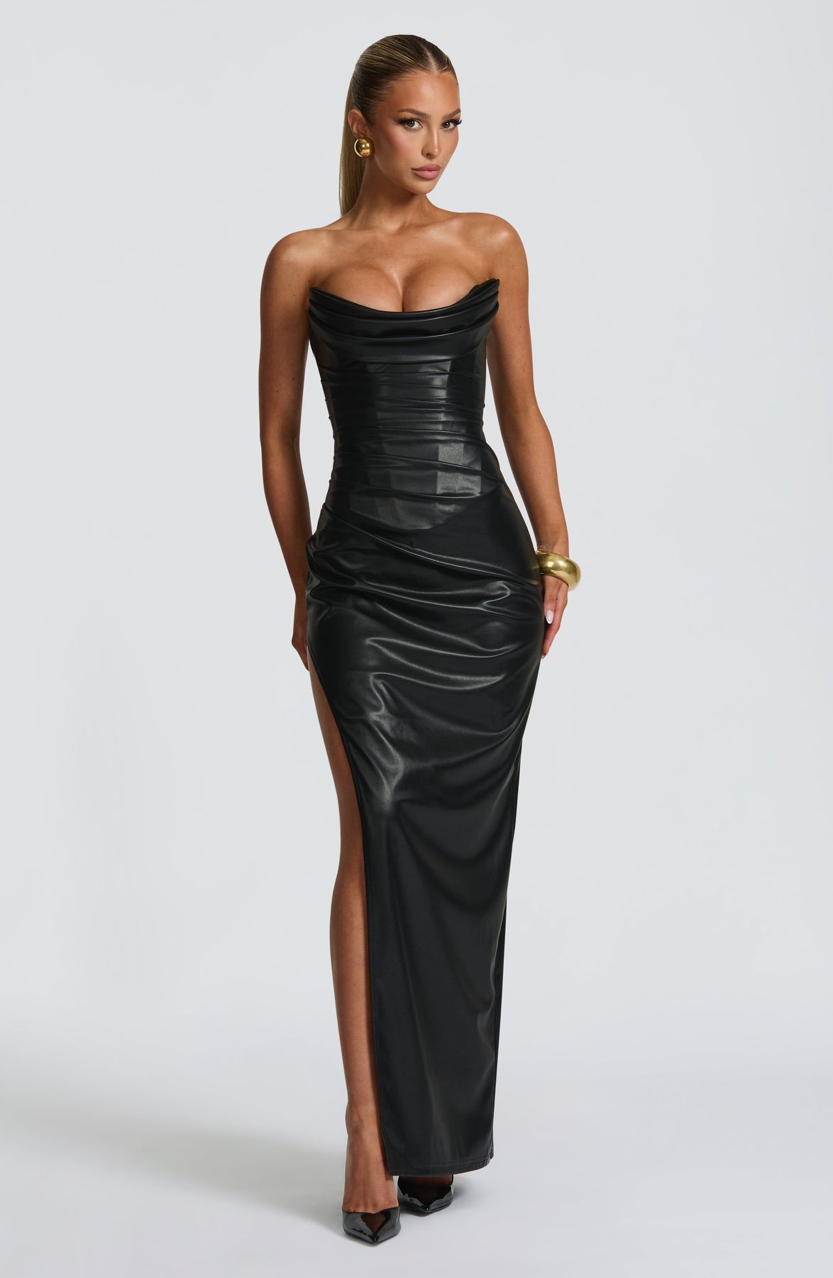The Alba Maxi Dress in black features a sleek faux leather finish and a scooped neckline with pleated cowl detailing. Its structured bodice, reinforced with boning and asymmetric pleating, offers refined shaping, while the column skirt and thigh-high split create a, sophisticated silhouette.