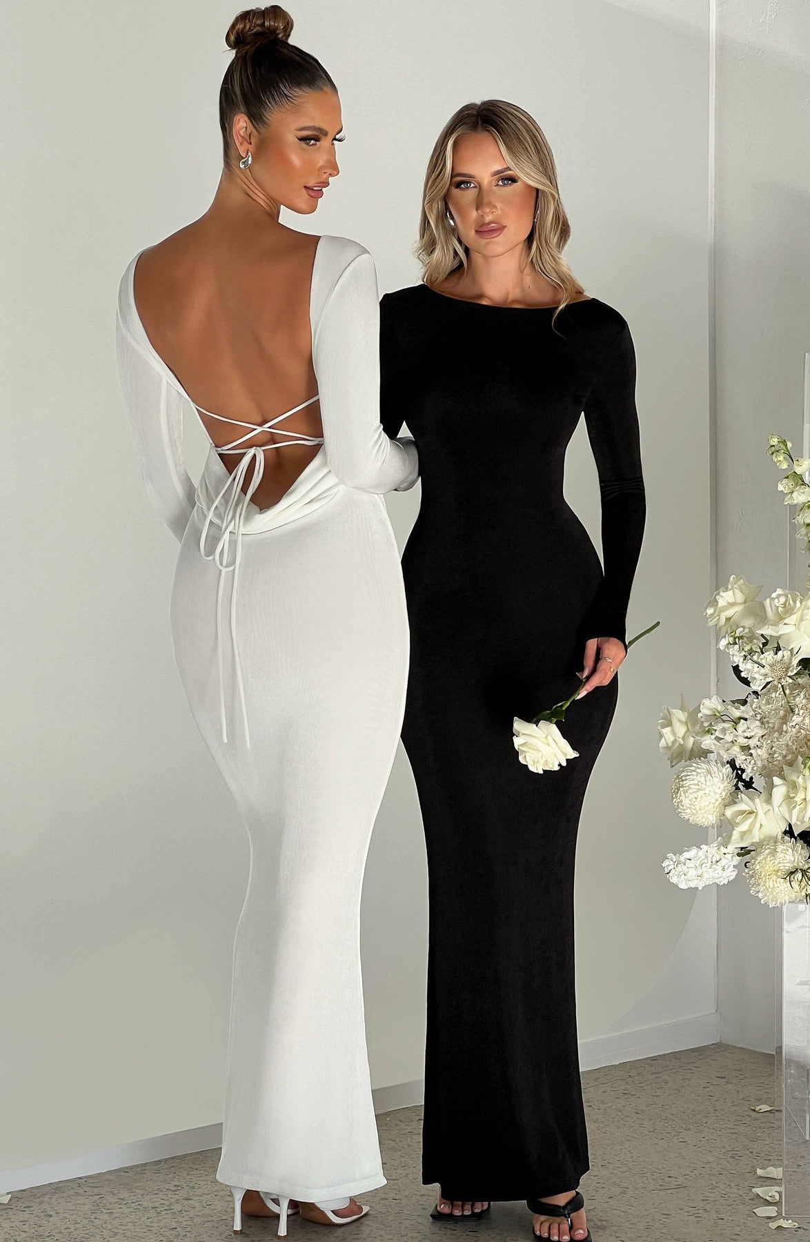 Feel sculpted and sexy in the Anastassia maxi, your new dress of dreams with long sleeves and a showstopping low back. Made from our signature double layered fabric, wear yours with loose waves and platform heels.