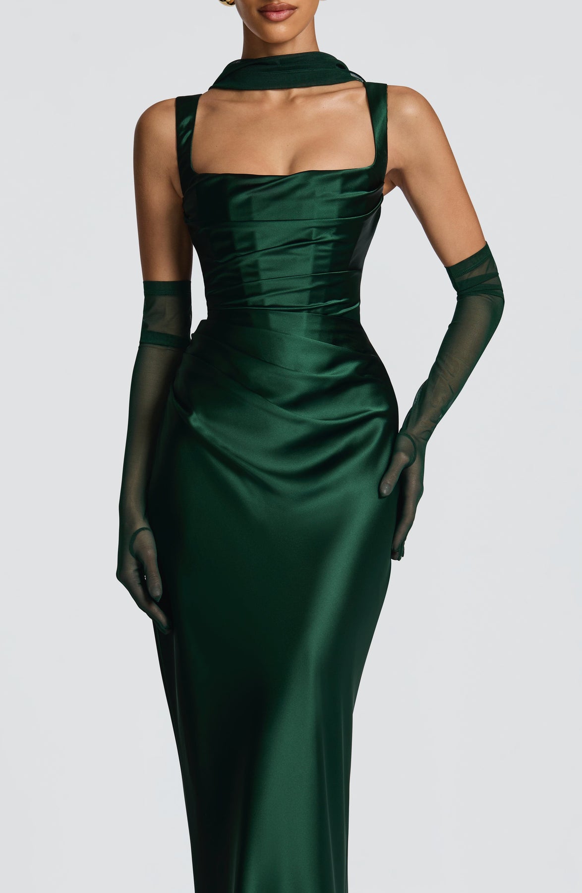 The Calanthe Maxi Dress in Emerald features a luxurious satin finish with a square neckline adorned by elegant pleated drape details. Asymmetric pleats on the bodice and tapered straps create a refined silhouette, while the lace-up back adds a delicate, sophisticated touch.