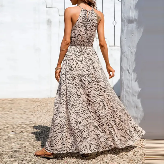 Pamela – Sommerkleid mit Leopardenmuster, Neckholder, ärmellos, schmaler Taille und Bindeschlitz für Damen