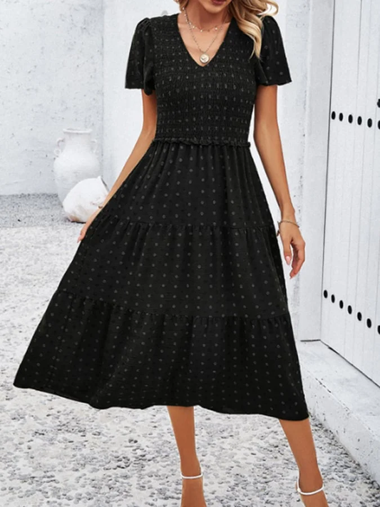 Jessica – Neues modisches Frühlings- und Sommer-Temperament. Lässiges, einfarbiges Kleid mit V-Ausschnitt und kurzen Ärmeln