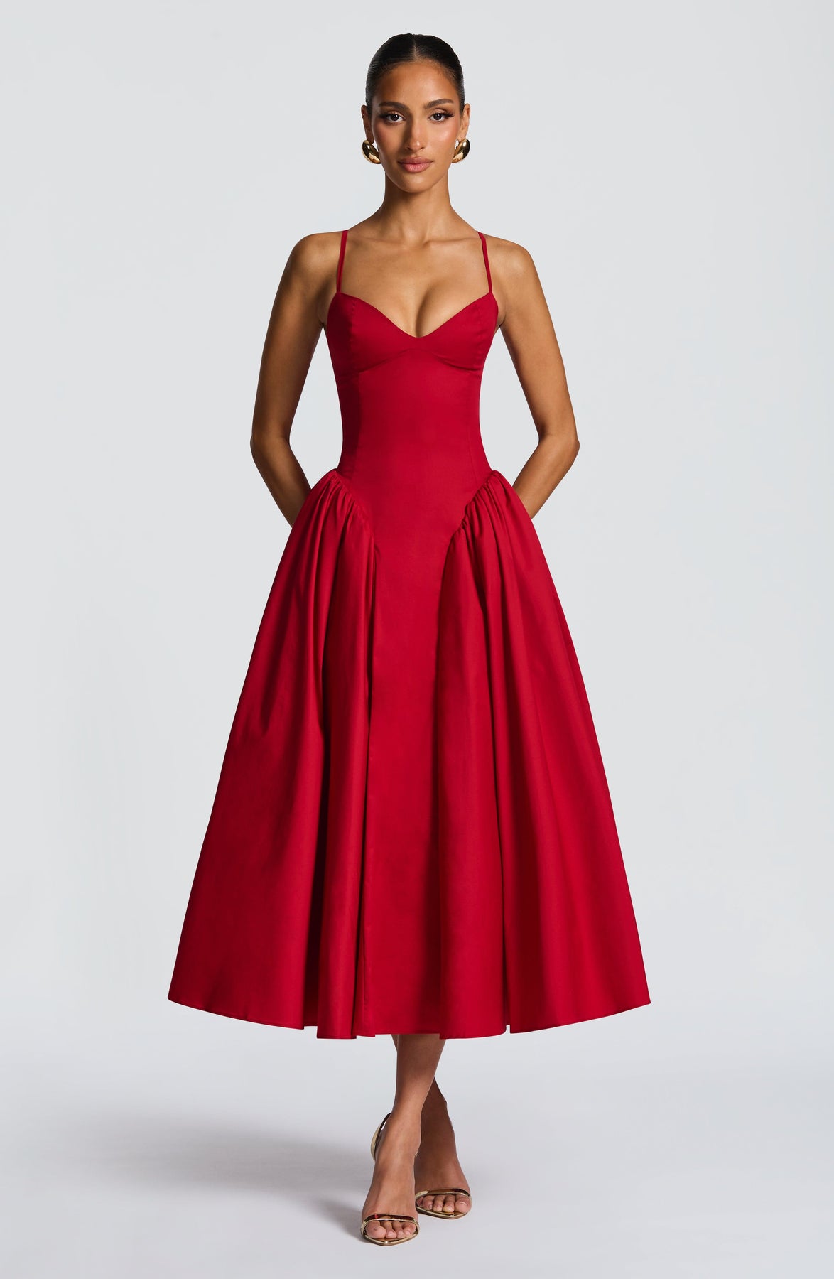 The Emerson Midi Dress in red features a flattering sweetheart neckline and a lace-up back for a tailored fit. Its dropped waist and gathered godet panels add elegant movement, while the tulle-lined skirt provides subtle volume for a refined silhouette.
