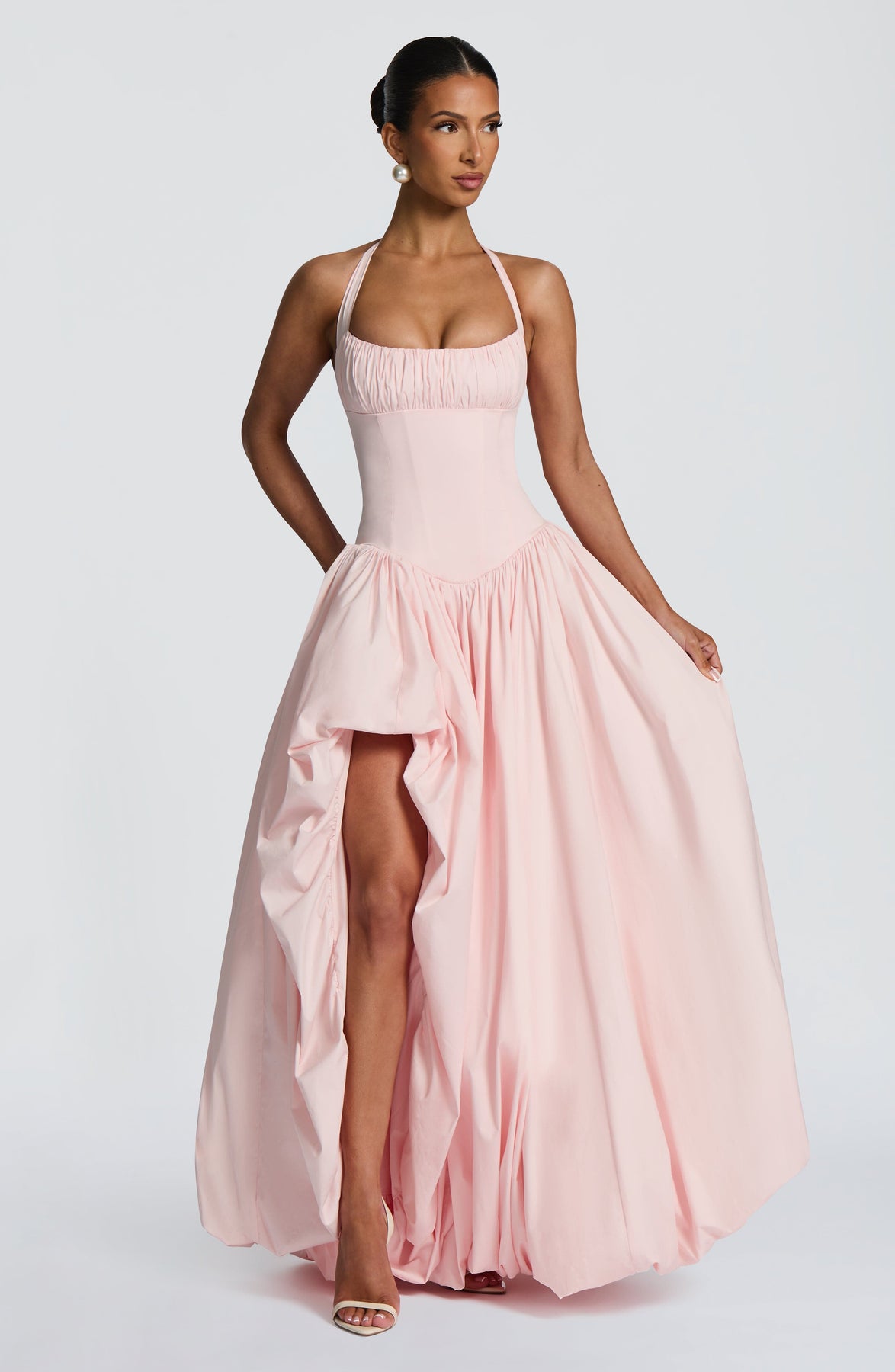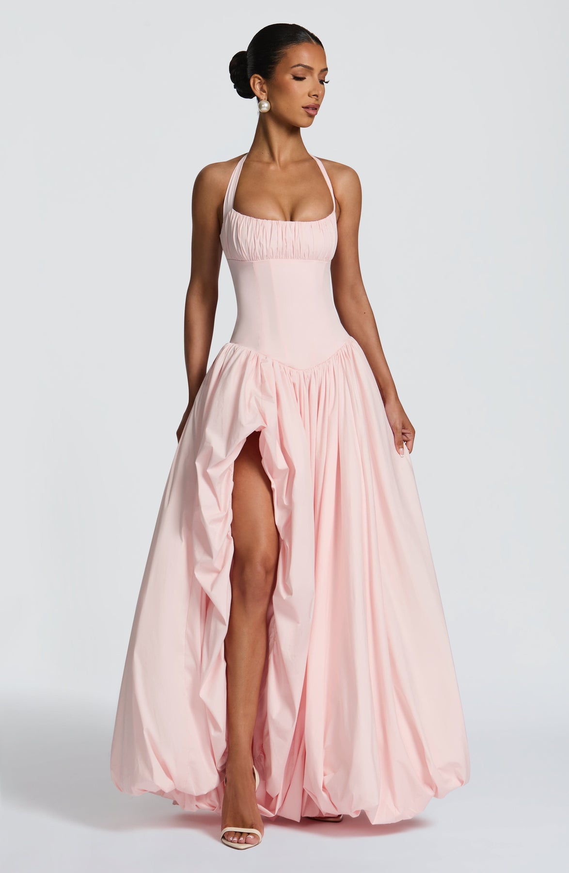 The Keira Maxi Dress in blush features a sleek straight neckline with halter straps and a tightly gathered bust panel for a refined silhouette. Its lace-up back with shirred detailing and internal boning ensure a perfect fit, while the dramatic puffball skirt and thigh-high split add elegant movement and allure.