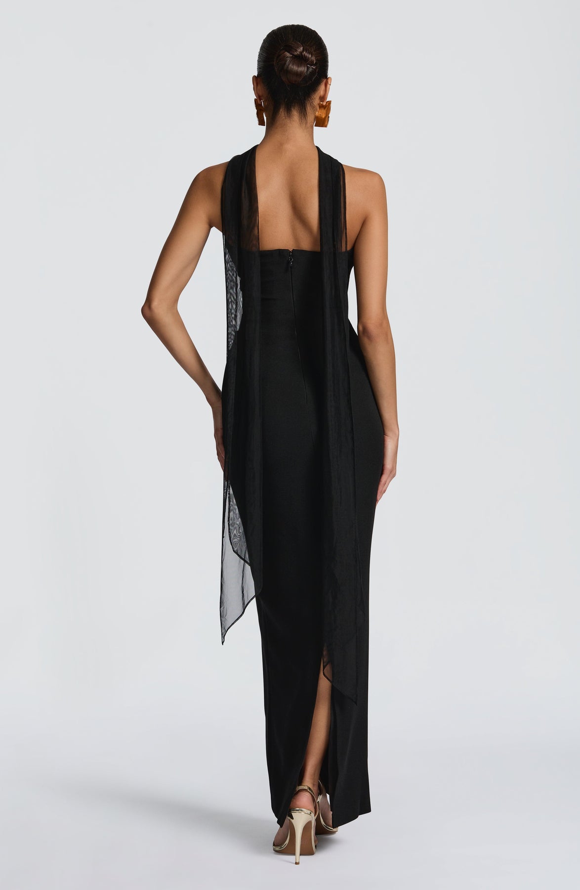 The Lindsey Maxi Dress in black features a strapless, cupped neckline with underwire and lightly padded cups for support and elegance. Crafted from non-stretch crepe, it offers a refined column silhouette with pleating at the waist and a centre back split for graceful movement.