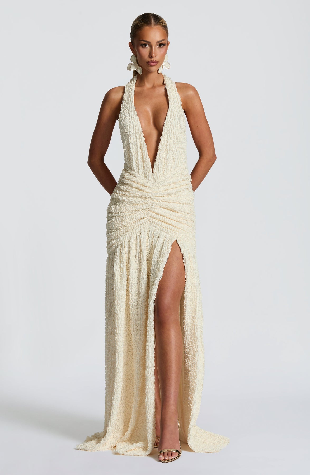The Minerva Maxi Dress in ivory features a textured cut-and-sew fabric with a deep plunging neckline and halterneck straps tied elegantly at the back. Its low V-shaped back and ruched hips enhance the silhouette, while a thigh-high split and full gathered skirt add graceful movement.