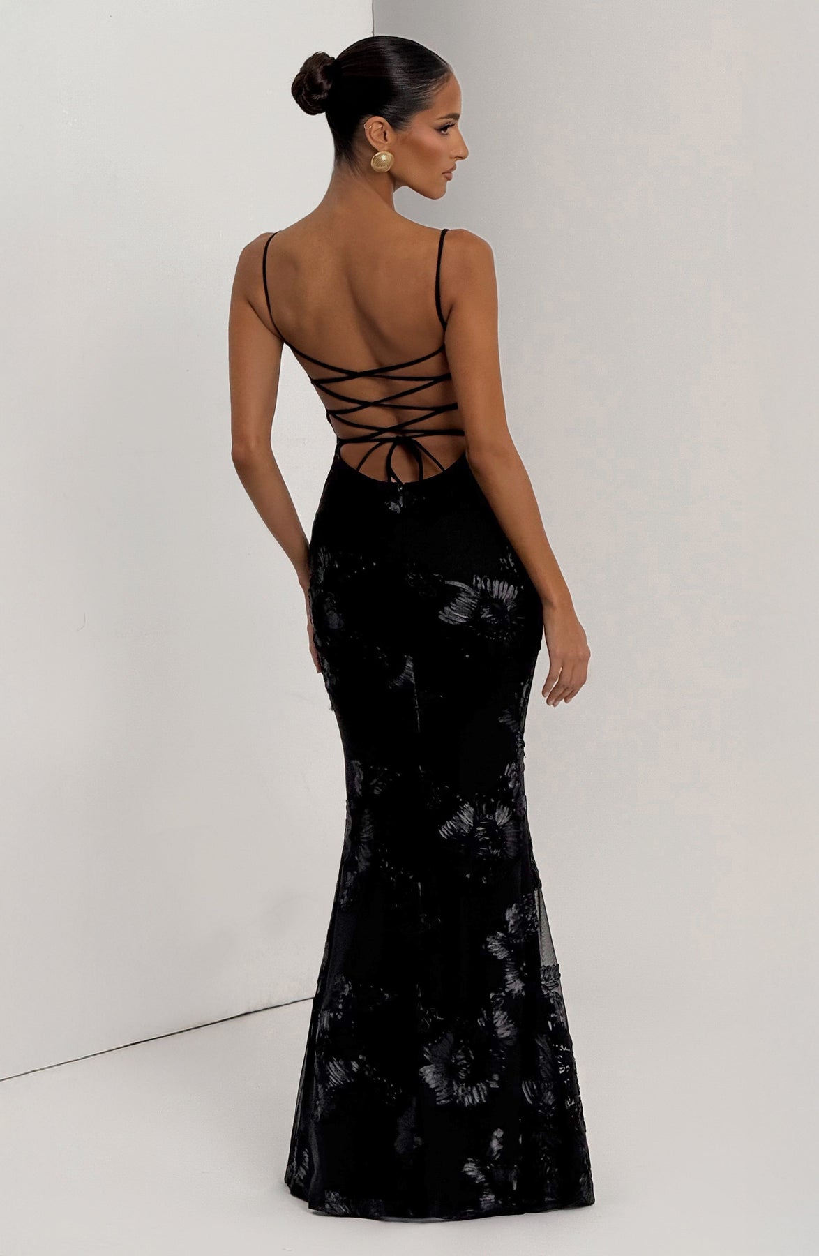 The Nefertiti Maxi Dress in black features stretch mesh adorned with delicate floral ribbon appliques. Designed with underwired cups, spaghetti straps, and an open lace-up back, it offers a refined silhouette. An internal corset with boning enhances the fit, while the fit-and-flare skirt adds elegant movement.