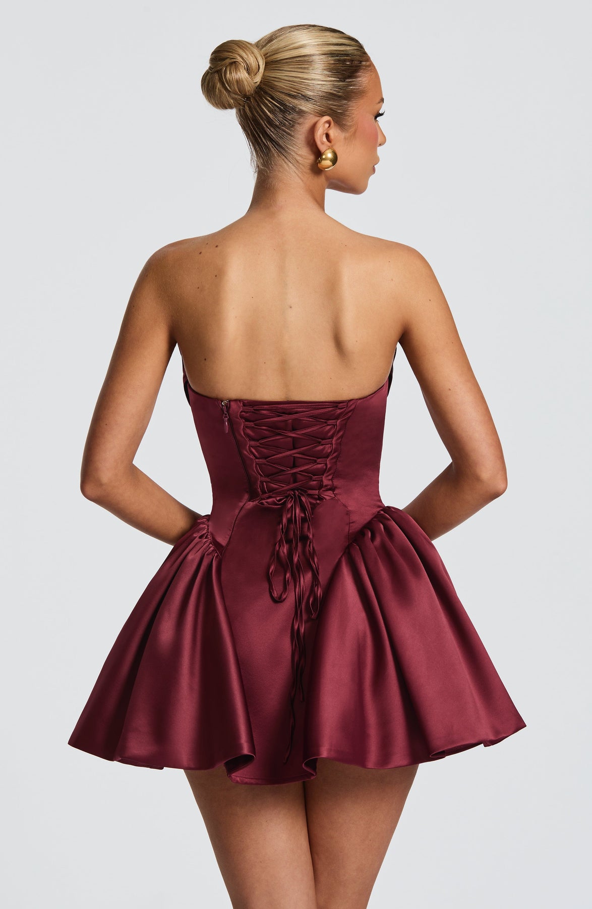 Get ready to turn heads with our Trinity Mini Dress in Cherry Lacquer! This stretch satin dress features a scooped neckline and lace up back, with boning in the bodice for a flattering fit. The full skirt has pleated godet panels and a detachable bow with dramatic tails.