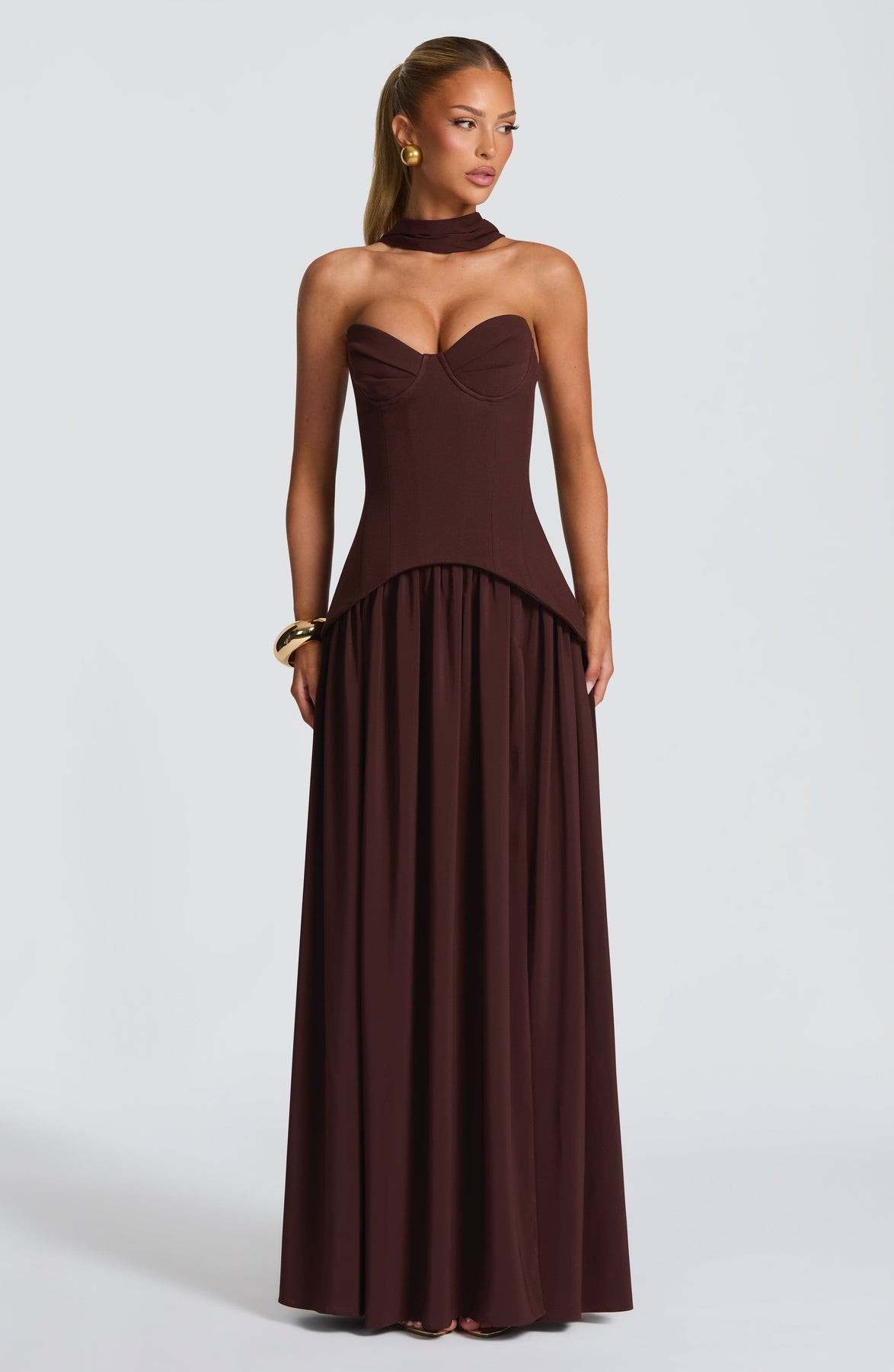 The Vietta Maxi Dress - Plum Brown features a chiffon skirt and matching scarf. Features underwired pleated cups, internal boning, and a lace-up back for a sculpted fit. Fully lined with a dramatic thigh-high split and gathered skirt.