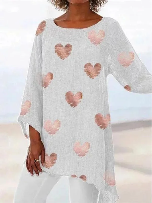 Colette – Damen-T-Shirt aus Baumwolle und Leinen mit Herzdruck und Rundhalsausschnitt