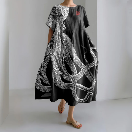 Lässiges Kunst-Maxikleid mit japanischem Kunst-Oktopus- und Krabben-Print