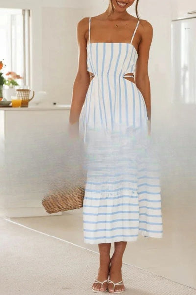Afrika – Exquisites, gestreiftes, hohles, plissiertes Patchwork-Midikleid mit Schnürung und Hosenträgern