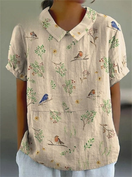 Gina – Lässiges Damenhemd aus Baumwolle und Leinen mit Vögeln und Zweigen und Rotkehlchen-Aufdruck