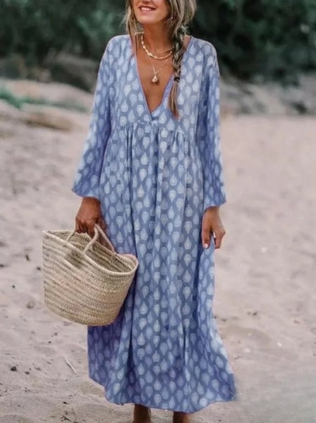 Julia - Lässiges bedrucktes Webkleid mit V-Ausschnitt und langen Ärmeln