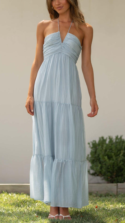 Karla - Ätherisch blaues trägerloses Maxikleid mit Transparenzen