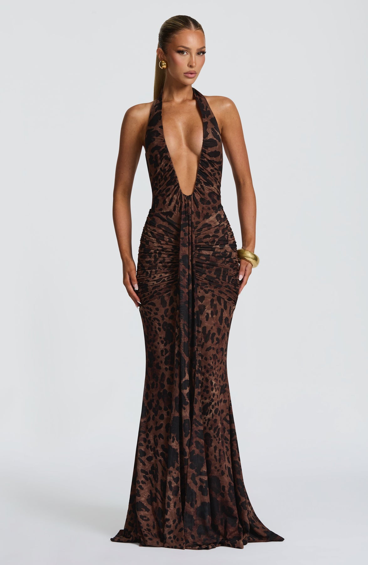 The Rosetta Maxi Dress in Leopard Print features a plunge halter neckline, ruched hips, and a full skirt with train, all in a custom stretch mesh exclusive to SORELLE BOUTIQUE.