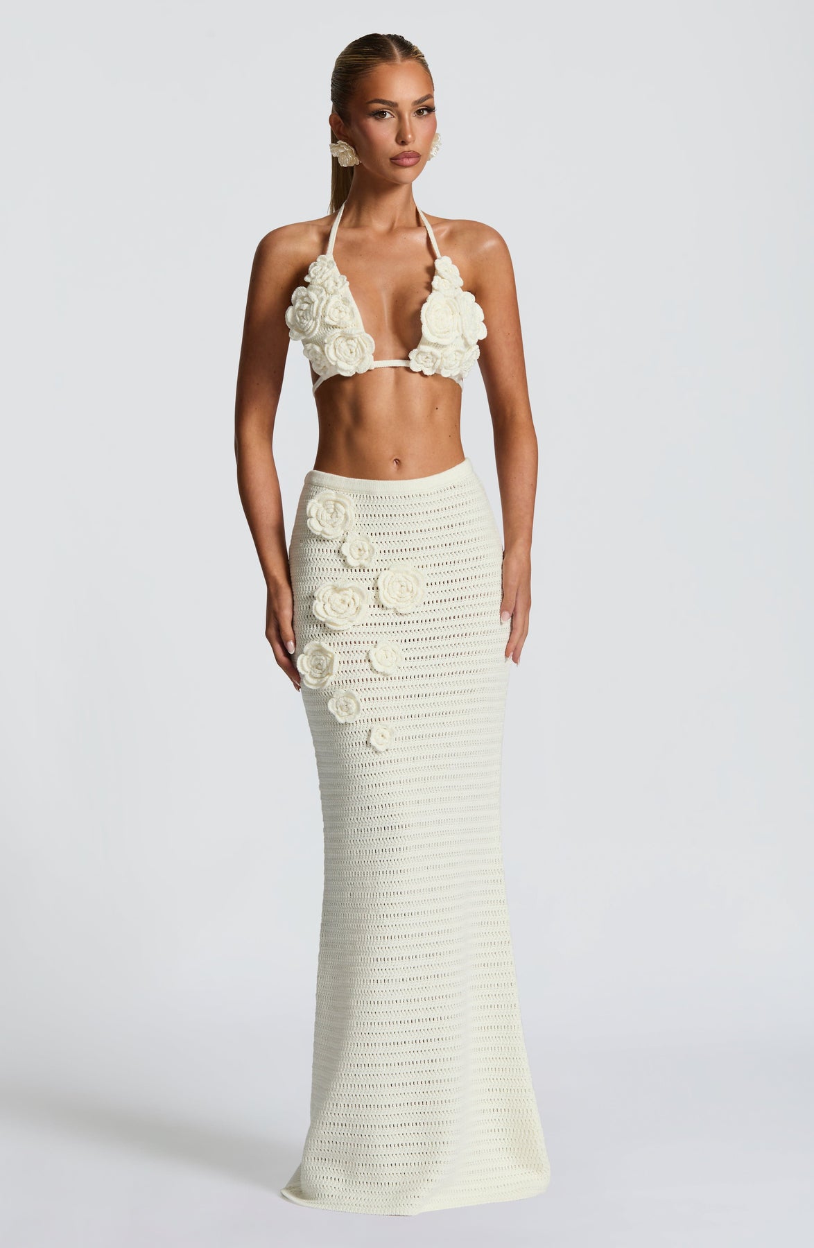 The Nerida Top in Ivory features a delicate knitted triangle bralette design adorned with intricate hand-crocheted flowers, creating a refined and elegant look. Adjustable ties at the neck and back ensure a perfect fit, making this piece both stylish and comfortable for sophisticated occasions.