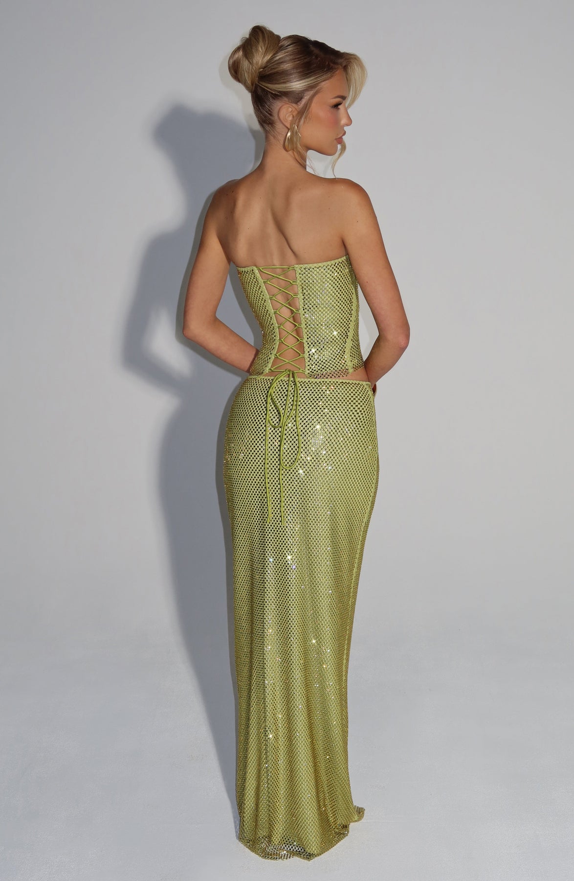 Colour: Olive. Stretch net. Embellished with square hotfix rhinestones. Fully lined in mesh. Lace up back. Semi-sheer appearance. Strapless neckline. Mid-length. Lace up back. Internal boning in back. No zipper. Style with the Hali Maxi Skirt.