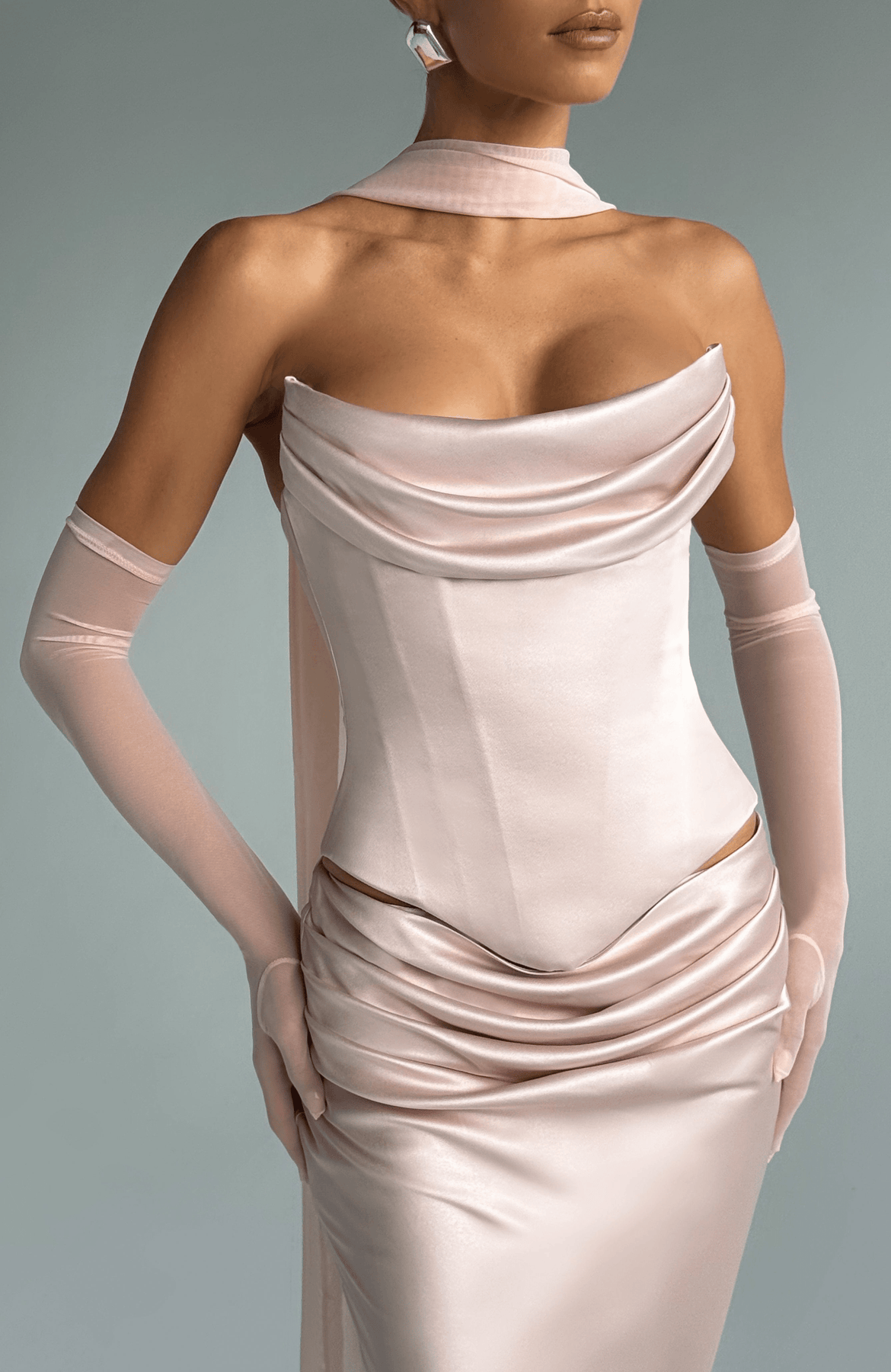 Los guantes Eli en color melocotón suave son la personificación de la elegancia. Confeccionados en delicada malla elástica, estos guantes hasta el codo ofrecen un acabado ligero y transparente que se adapta a la perfección a los brazos. Combinan con la bufanda Ayla , el corsé Calista y la falda larga Bernadette, aportando un toque suave y etéreo a tu conjunto.