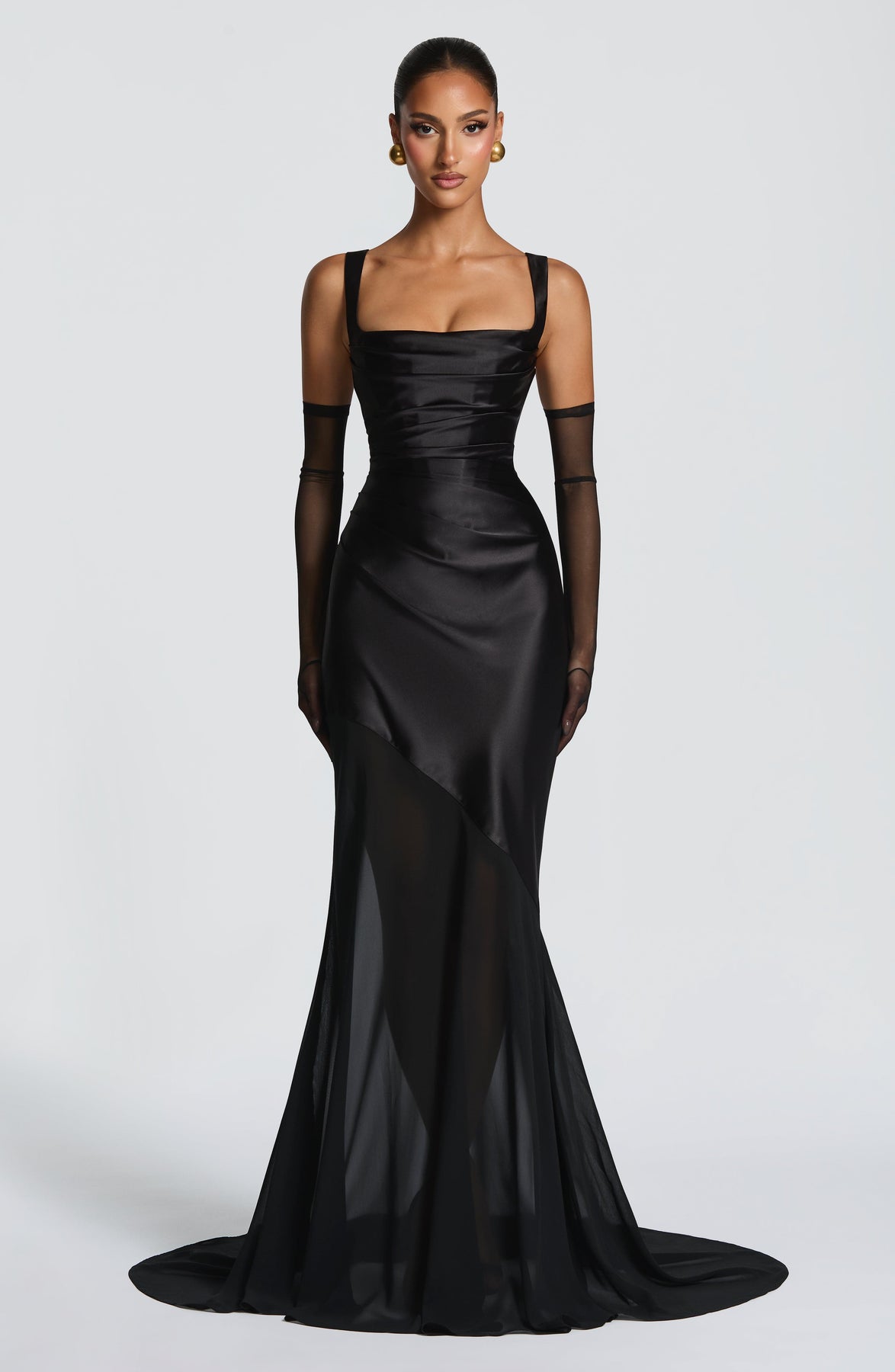 El vestido Eliza en negro presenta un corpiño de satén con escote cuadrado y pliegues asimétricos en la cintura. Los tirantes finos, el corsé interior y la espalda con cordones estilizan la silueta. La falda de gasa semitransparente se extiende hasta un espectacular bajo y cola acampanados.