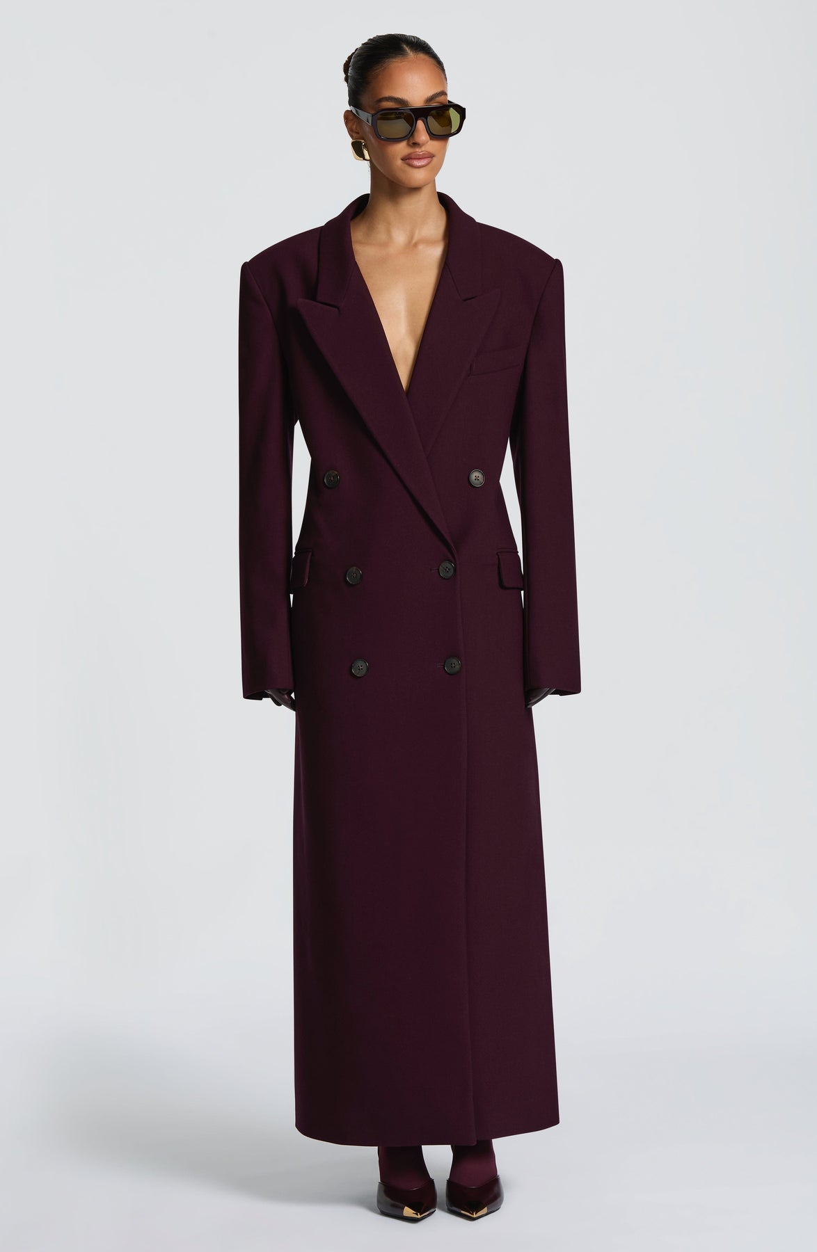 El abrigo Michelle, en color ciruela intenso, presenta un corte cuadrado y estructurado, confeccionado en tejido de traje no elástico. Su silueta larga se refina con un frente cruzado, cuello con solapas de pico y correa ajustable en la cintura para una elegancia a medida. Entre sus prácticos detalles se incluyen bolsillos dobles de ribete con solapa y una abertura en la parte central trasera.