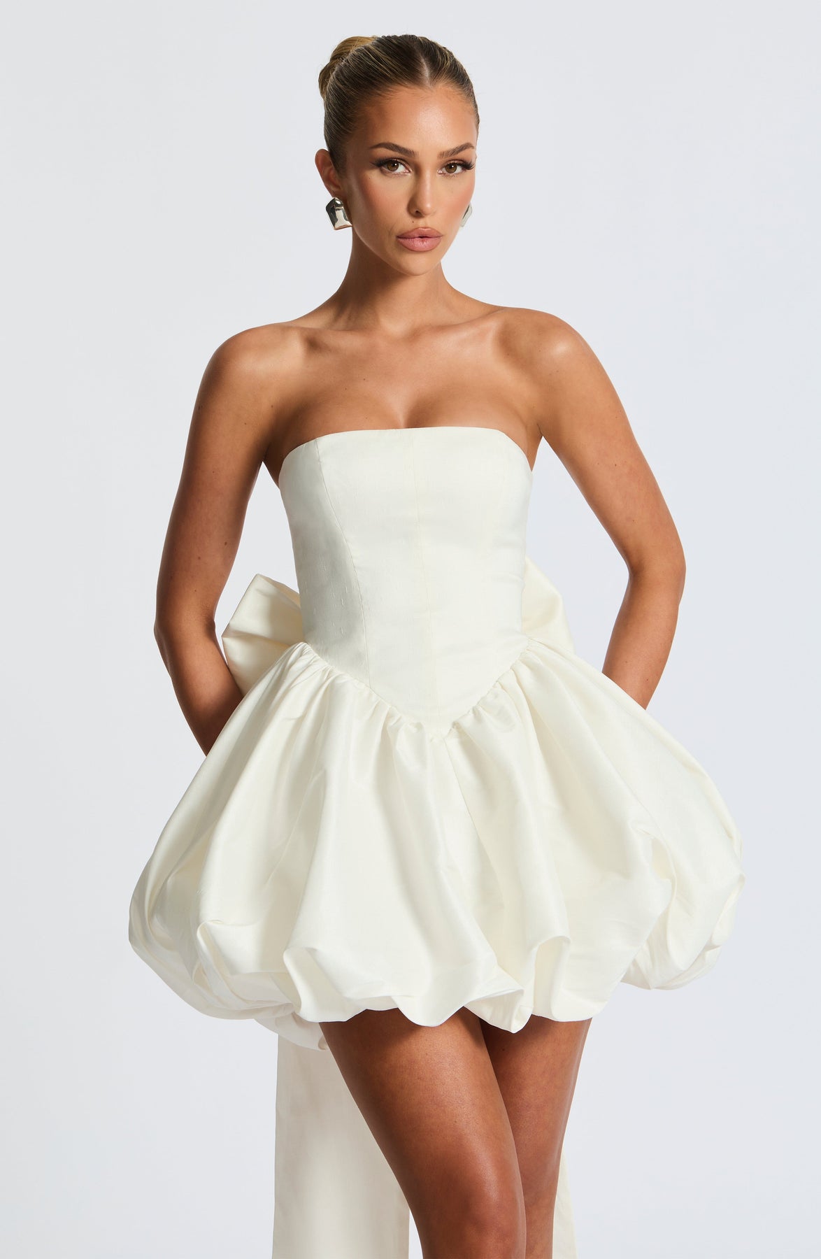 Disfrute del lujo con nuestro minivestido Lotus. El tafetán texturizado acentúa el largo mini y el escote palabra de honor, mientras que las varillas del corpiño le proporcionan un ajuste perfecto. La falda abullonada se frunce en la cintura para una silueta favorecedora. Con espalda con cordones y lazo desmontable, este vestido derrocha sofisticación y elegancia.