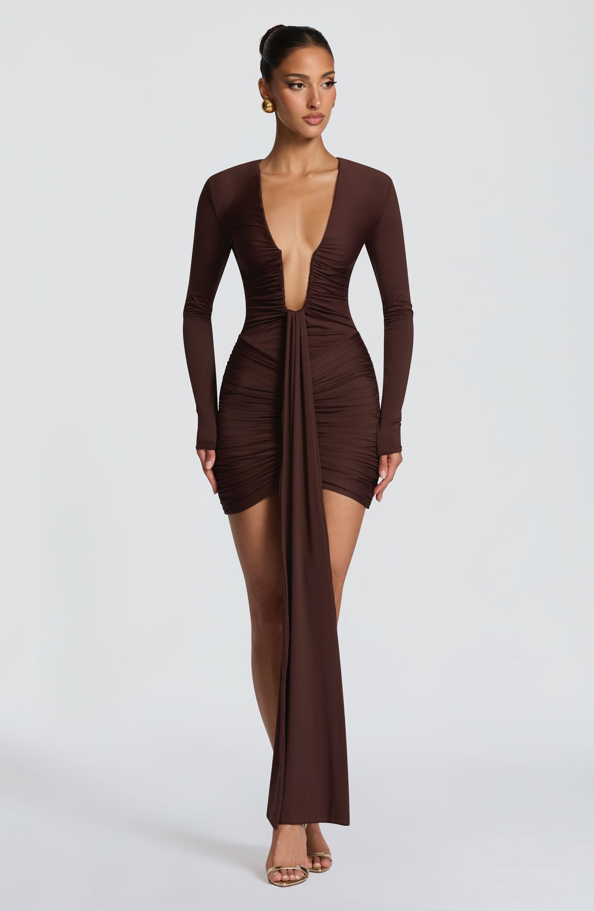 El minivestido Tara en color marrón ciruela combina jersey elástico con atrevidos detalles de diseño. Su escote profundo y esculpido con aros en U, mangas largas ajustadas y frunces estratégicos en el escote y la cadera crean una silueta refinada. La minifalda ajustada presenta frunces, bajo en V y un panel central drapeado.