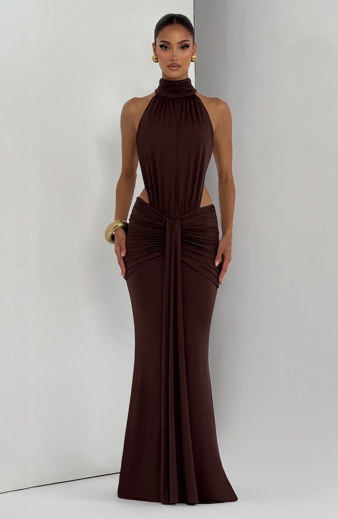 Vestido largo Thekla en color marrón ciruela. Jersey elástico y ceñido con cuello alto fruncido, corpiño fruncido y atrevidos cortes laterales. Presenta una espalda abierta profunda y una silueta sirena con un espectacular detalle de cola.