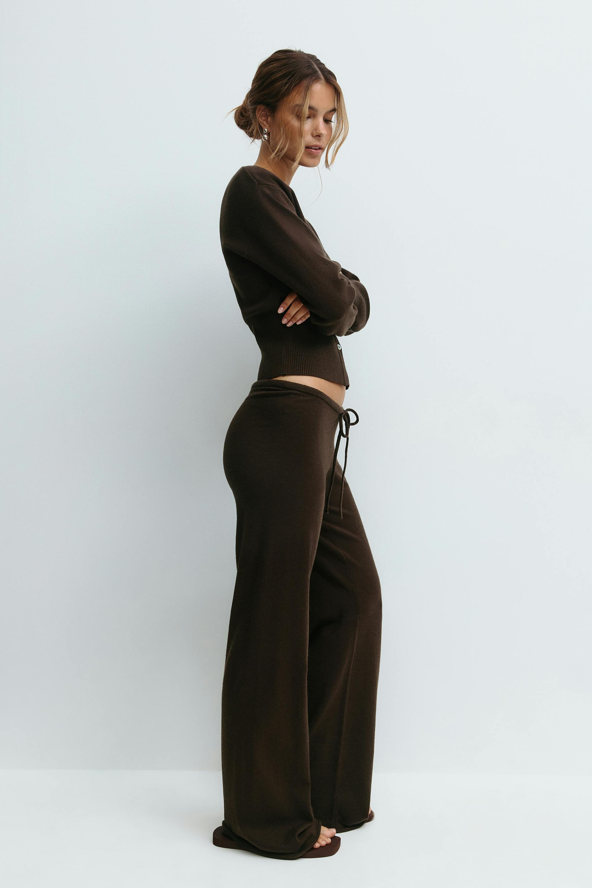 Suave, esculpido y discreto: este conjunto de punto hace que quedarte en casa luzca mejor que salir. El top corto enmarca tu figura a la perfección, mientras que los pantalones de cintura alta la suavizan y alargan. Cómodo, favorecedor y listo para todo.