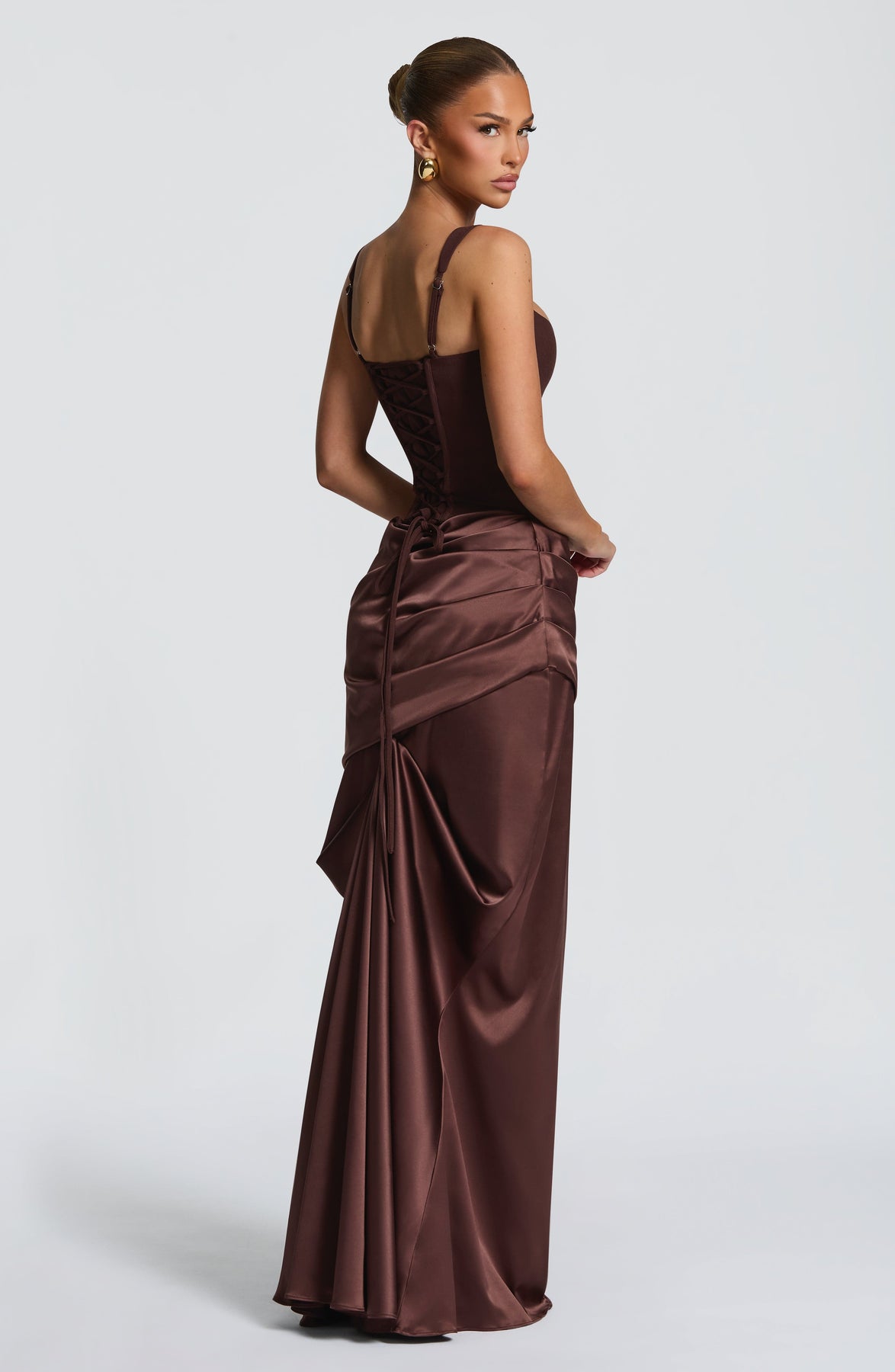 El corsé Nixie en color marrón ciruela es una prenda estructurada confeccionada en crepé no elástico con ballenas internas que esculpen la silueta. El corpiño ajustado presenta un escote cuadrado y tirantes cónicos, mientras que la espalda con cordones permite un ajuste personalizado y ceñido.