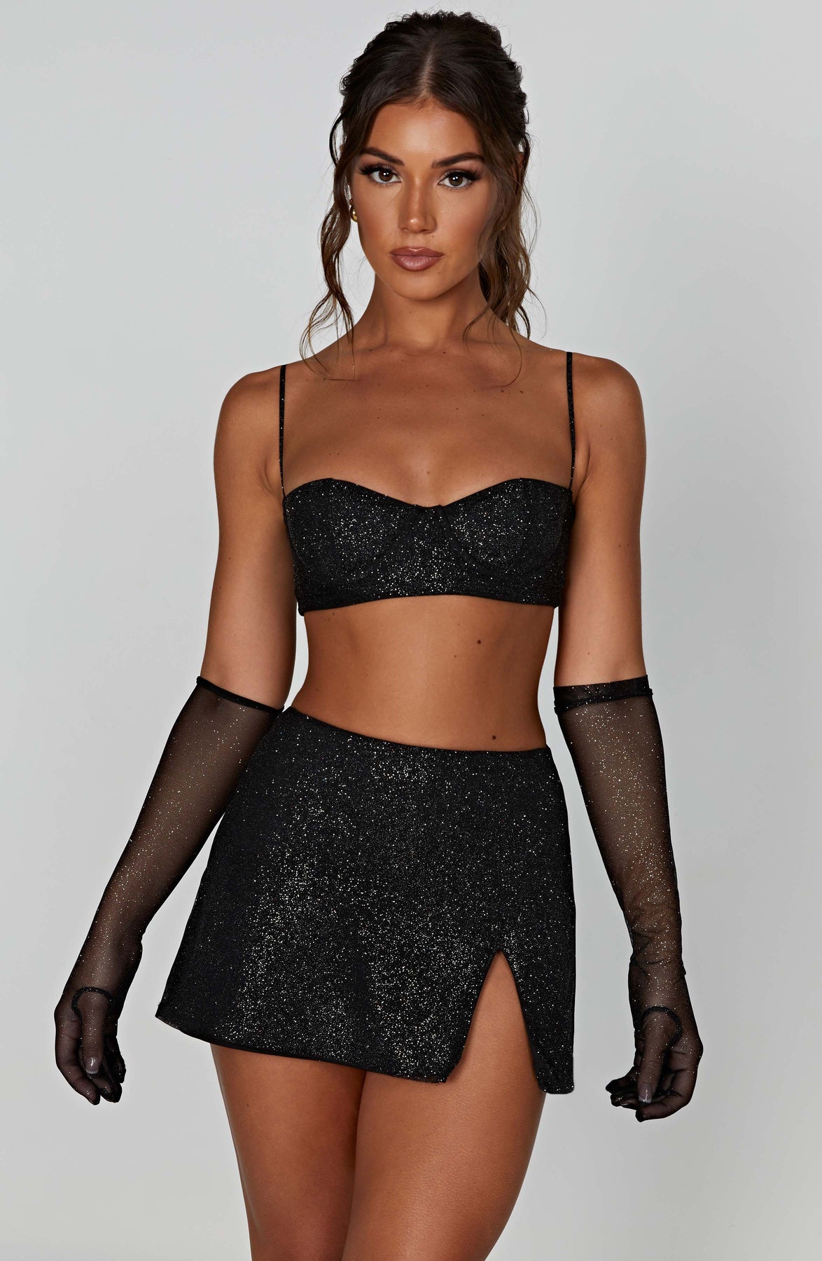 Brilla en la noche con el espectacular Posie, un top corto confeccionado en nuestra malla especial personalizada con detalles brillantes. Con tirantes finos, se adapta a tu figura y copas con aros que enmarcan y realzan el busto. Combínalo con la falda Posie, guantes hasta el codo y tus tacones más altos.