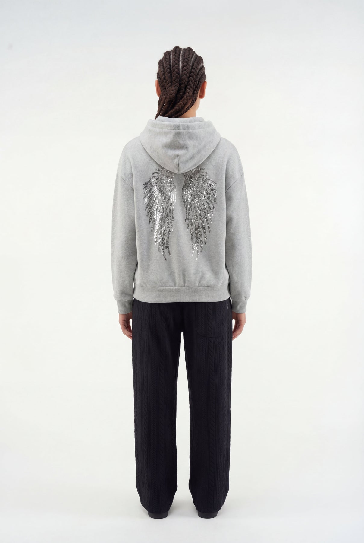 Comodidad sin esfuerzo con un toque sutil. La sudadera con capucha Angel presenta un corte holgado con tejido suave y detalles brillantes de alas en la espalda, que le dan un toque sobrio a un básico clásico. Impecable por delante y expresiva por detrás, está diseñada para el día a día con un toque minimalista de la Generación Z. Fácil de combinar, fácil de amar.