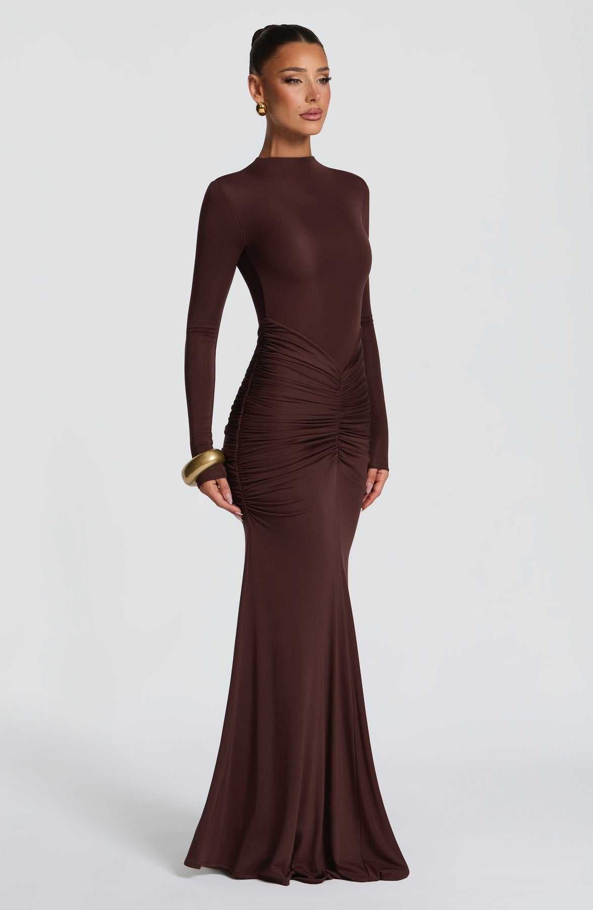El vestido largo Oriane en color marrón ciruela está confeccionado en suave jersey de modal. Esta prenda presenta escote alto y mangas largas para una cobertura refinada. La distintiva cintura en V y los detalles fruncidos en la cadera crean una silueta estilizada, mientras que el corte entallado y acampanado garantiza una libertad de movimiento elegante.