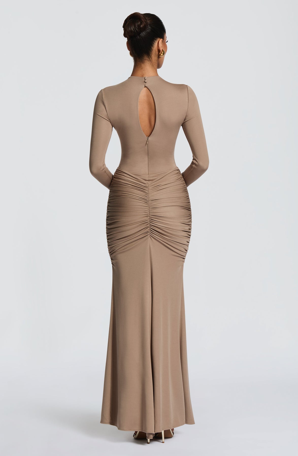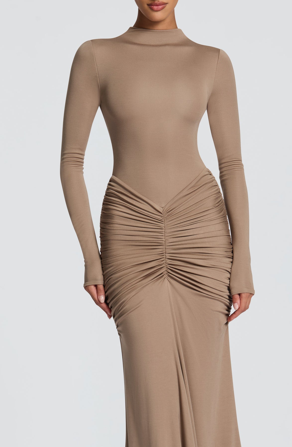 El vestido largo Oriane en color piedra está confeccionado en suave jersey de modal. Esta prenda presenta escote alto y mangas largas para una sofisticación atemporal. La distintiva cintura en V y los detalles fruncidos en la cadera crean una silueta favorecedora, mientras que su corte ajustado y evasé ofrece un movimiento elegante.