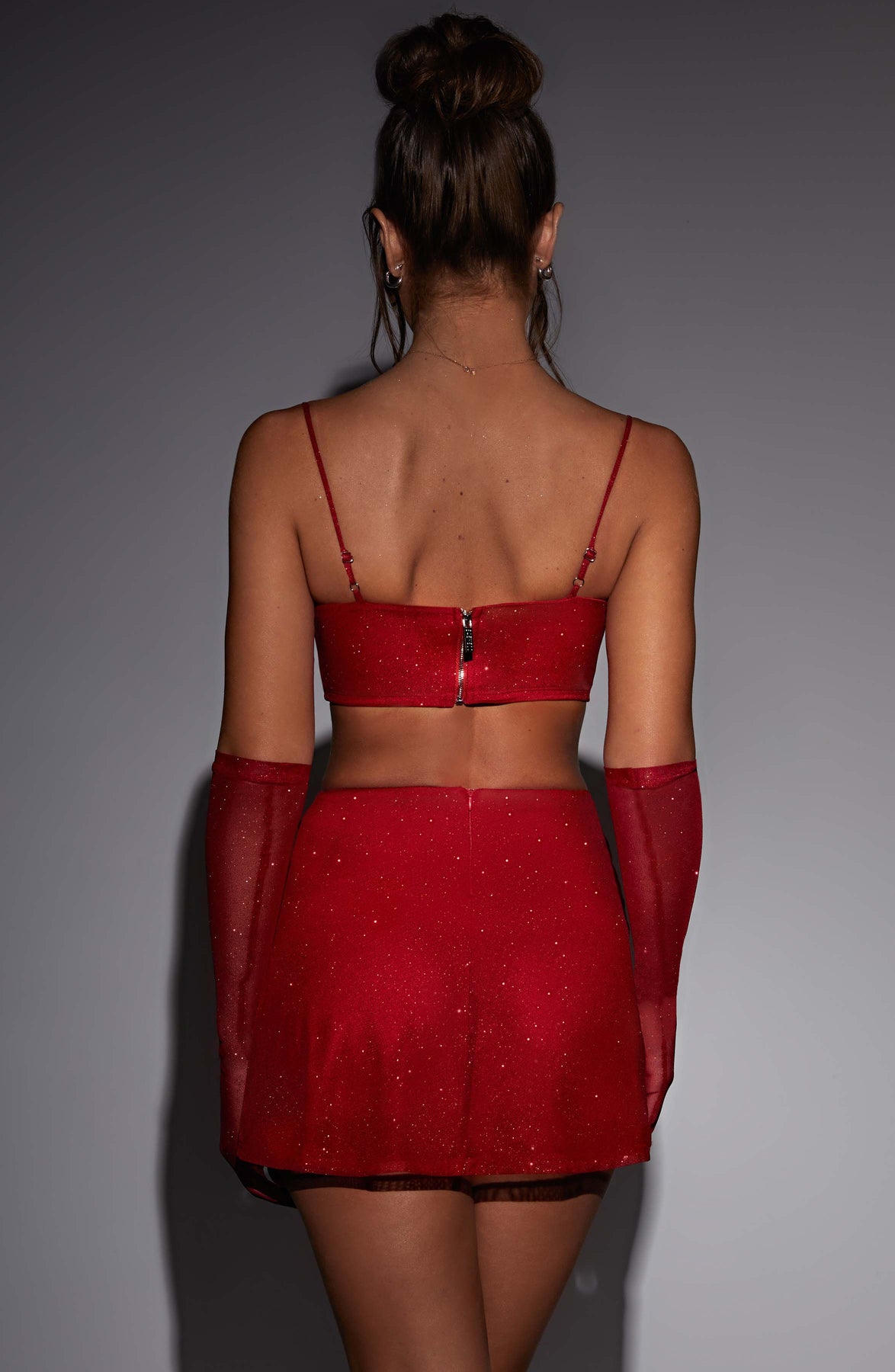 Brilla en la noche con la espectacular minifalda Posie, confeccionada en nuestra malla especial personalizada con detalles brillantes. Su corte se adapta a tu figura, con una ligera abertura en la falda que le da el toque perfecto de pierna. Combínala con el top Posie, los guantes Pixie hasta el codo y tus tacones más altos.
