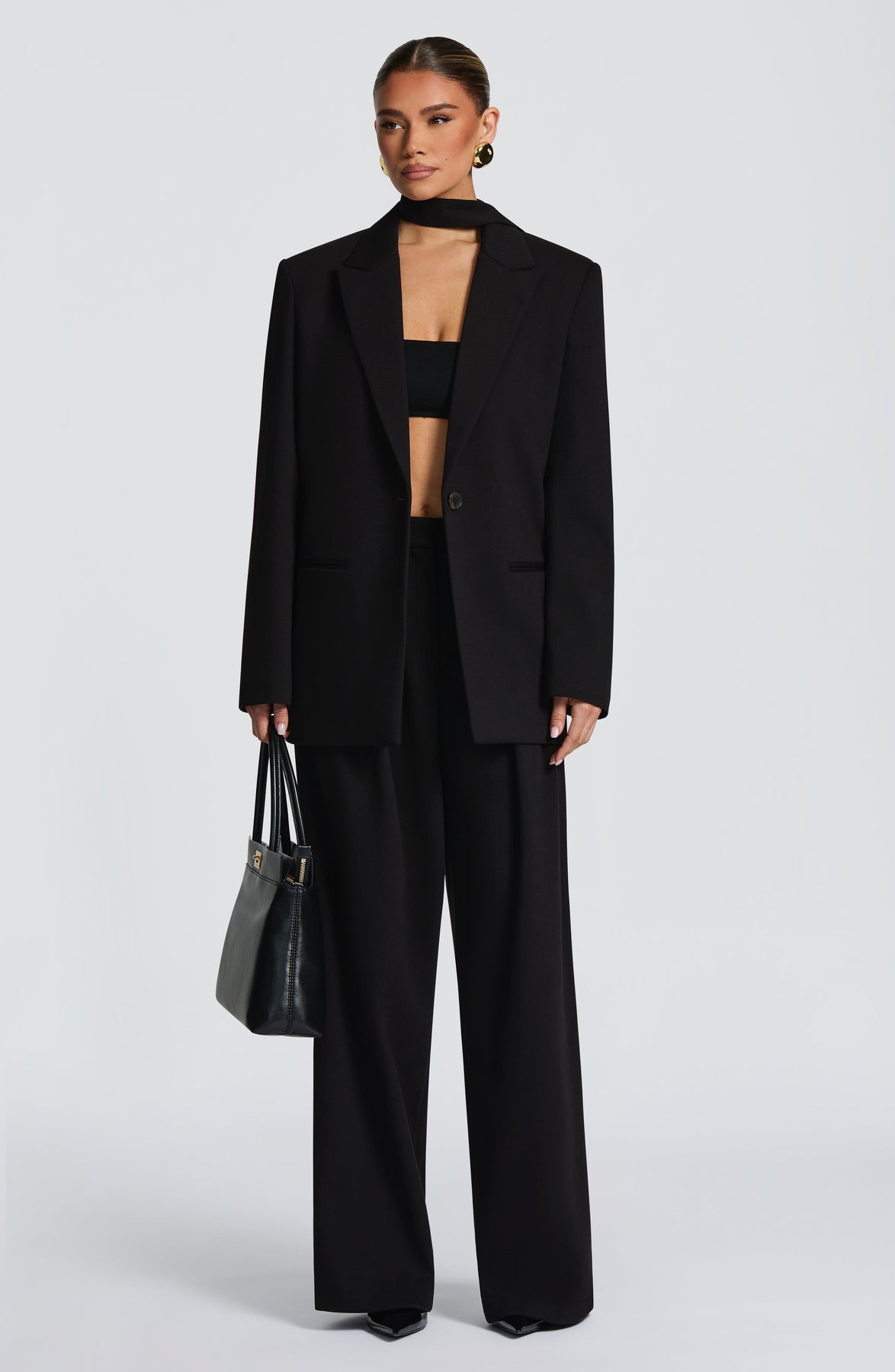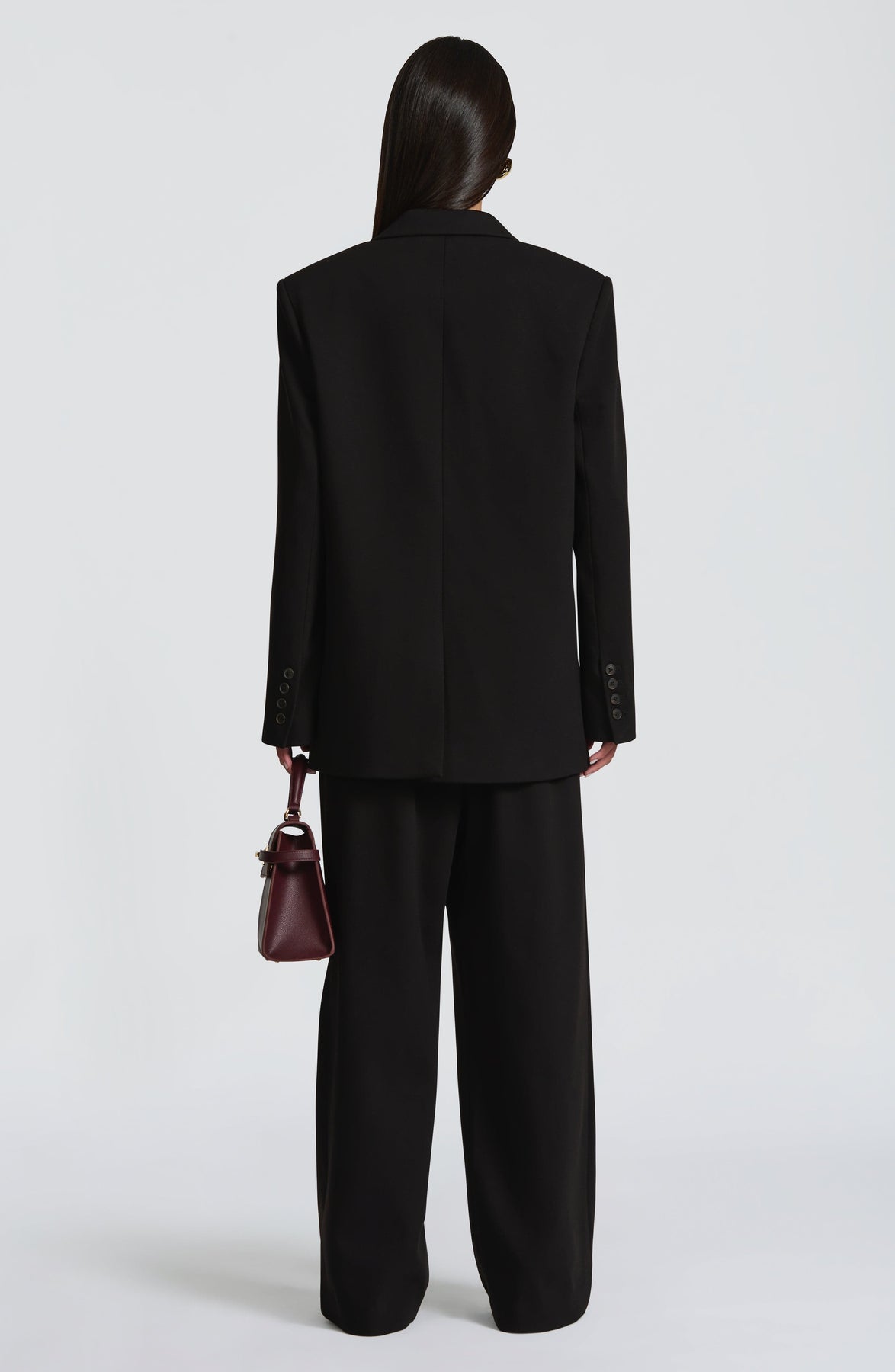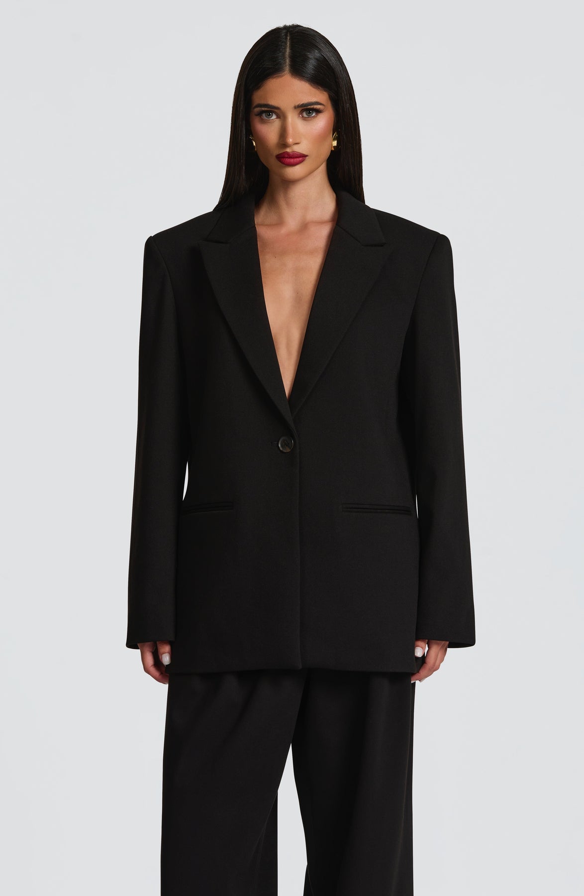 El blazer Reece en negro presenta un tejido de traje no elástico que le da un aspecto estructurado y refinado. Su cuello con solapa de muesca y su silueta extragrande y cuadrada le dan un estilo moderno y sofisticado. Se completa con un cierre de un solo botón y dos bolsillos de ribete dobles.