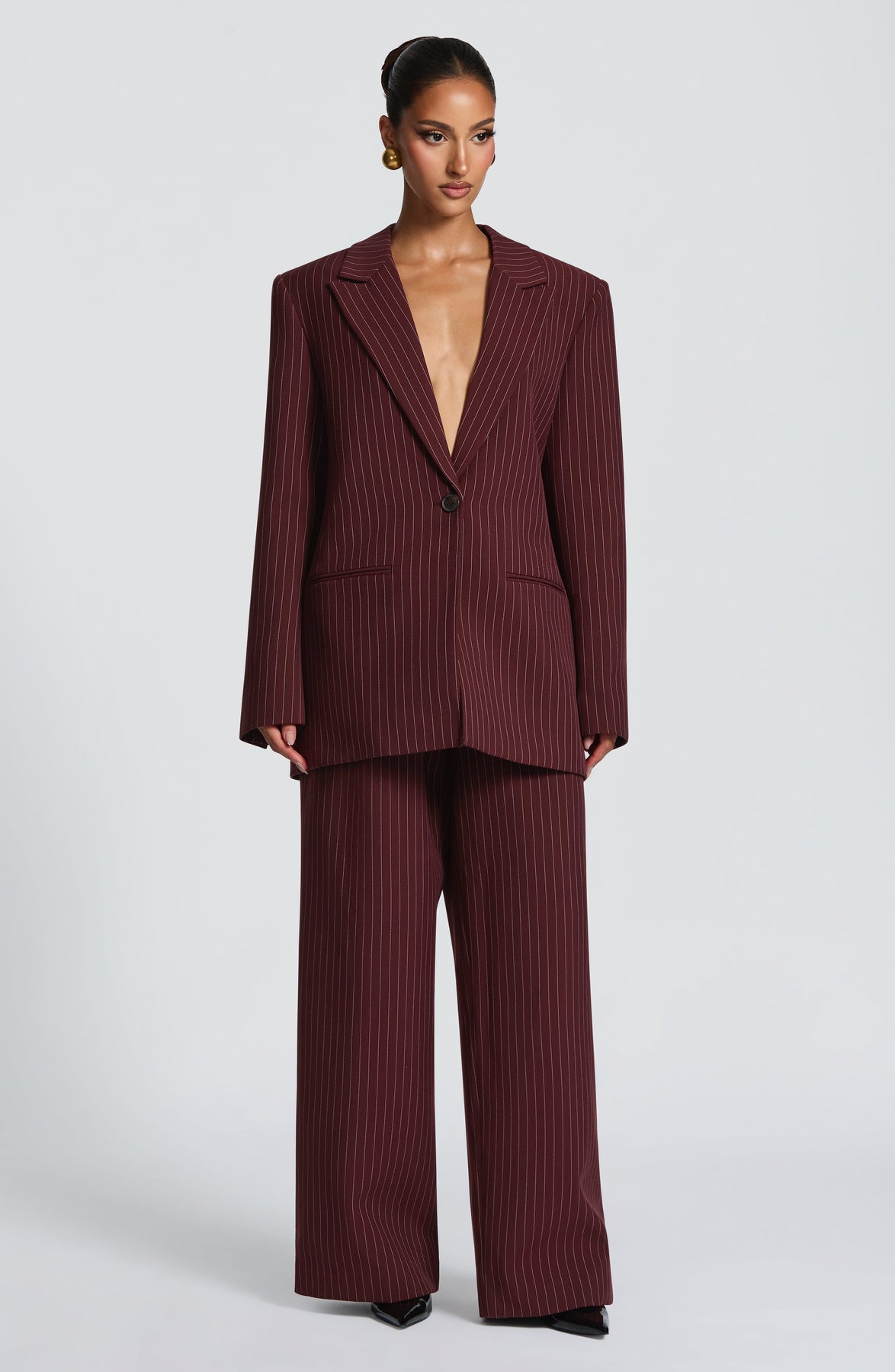 Blazer Reece en raya diplomática burdeos intenso, confeccionado en tejido de traje estructurado no elástico para un acabado elegante y duradero. Presenta cuello con solapa de muesca, cierre frontal de un solo botón y una silueta extragrande y cuadrada que impone presencia. Dos bolsillos de ribete completan su elegante confección.
