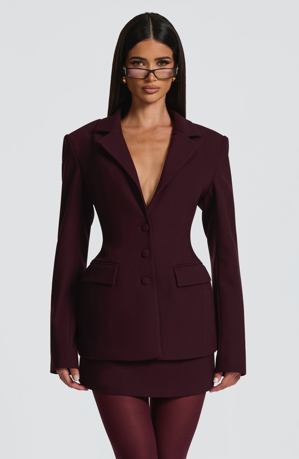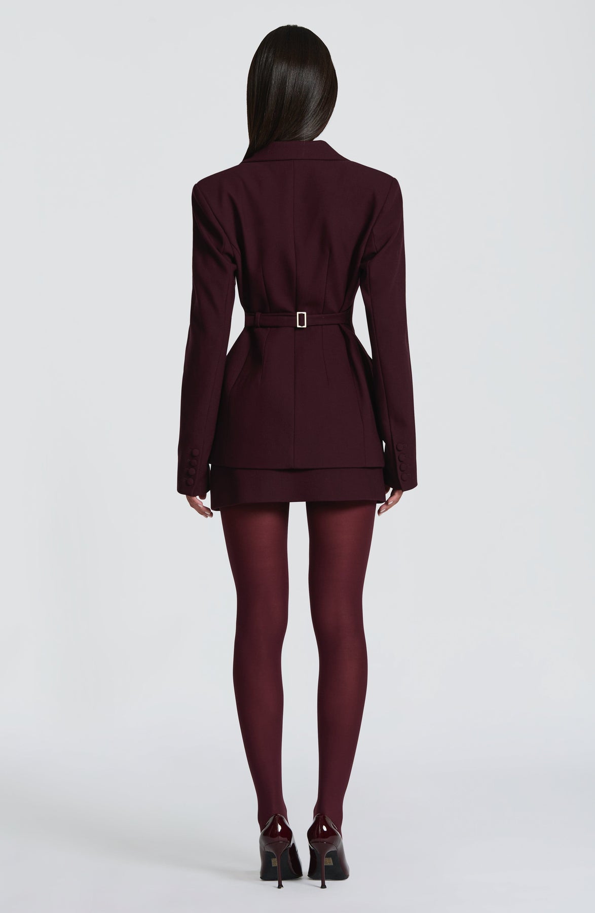 Colour: Plum. Non-stretch woven suiting fabric. Fully lined. Notched lapel collar. Single breasted. Self-covered buttons. Button down closure. Front flap pockets. Adjustable waist strap. Cinched waist. Rounded hips. Shoulder pads. Style with Vinnie Scarf and Edna Mini Skirt.