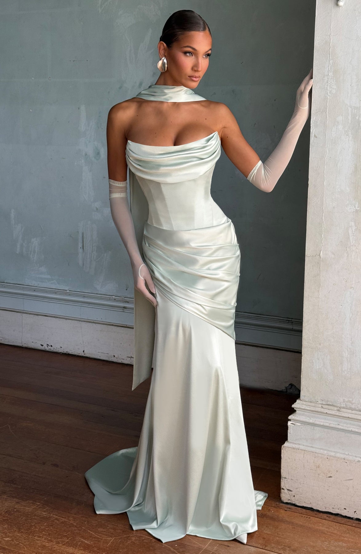 The Sybil Scarf in Mint is effortlessly elegant. This long, satin scarf drapes beautifully over the neck, adding a sleek, polished touch to any look. Pair it with the Kensington Maxi Dress and Eli Gloves in Mint for a perfectly coordinated, head-turning ensemble. Timeless, versatile, and undeniably chic.