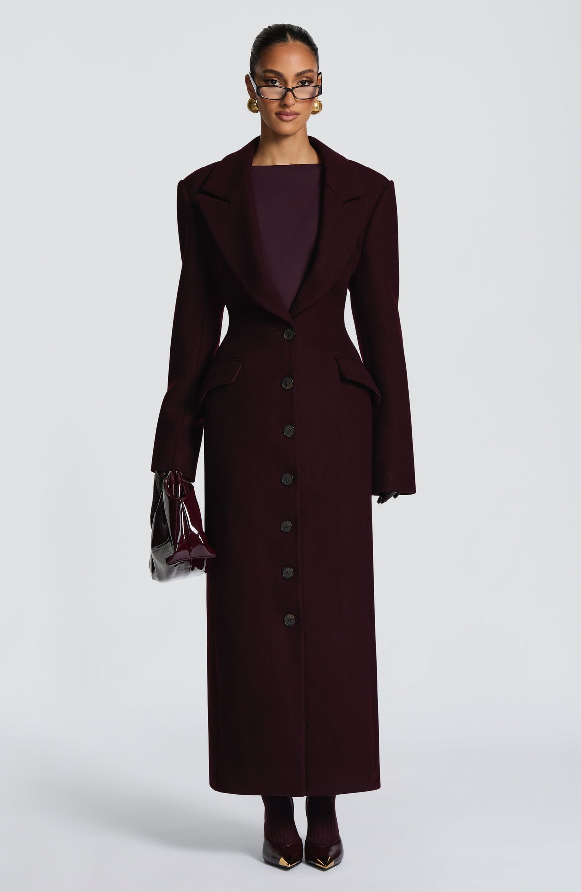 Colour: Plum. Wool blend. Fully lined. Full length. Notched Collar with wide lapels. Angled welt pockets with flaps. Multi button down closure. Adjustable waist strap. Shoulder pads. Centre back vent. Pair it with Talin Scarf, Frankie Gloves Edna Mini Skirt and Tori Bodysuit.