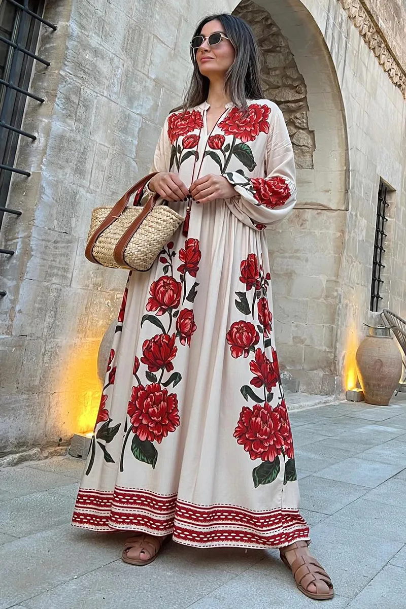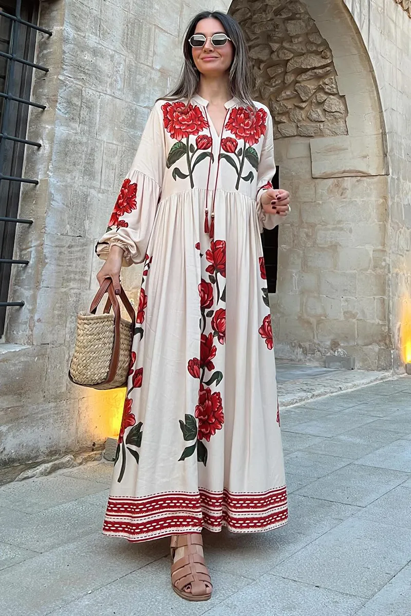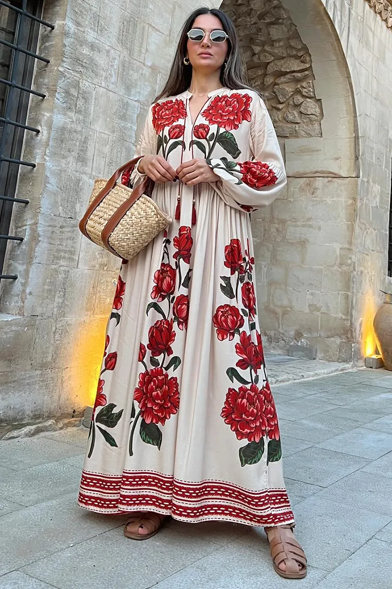 Vanessa – Urlaubs-Maxikleider mit gekerbtem V-Ausschnitt, langen Ärmeln und Blumendruck