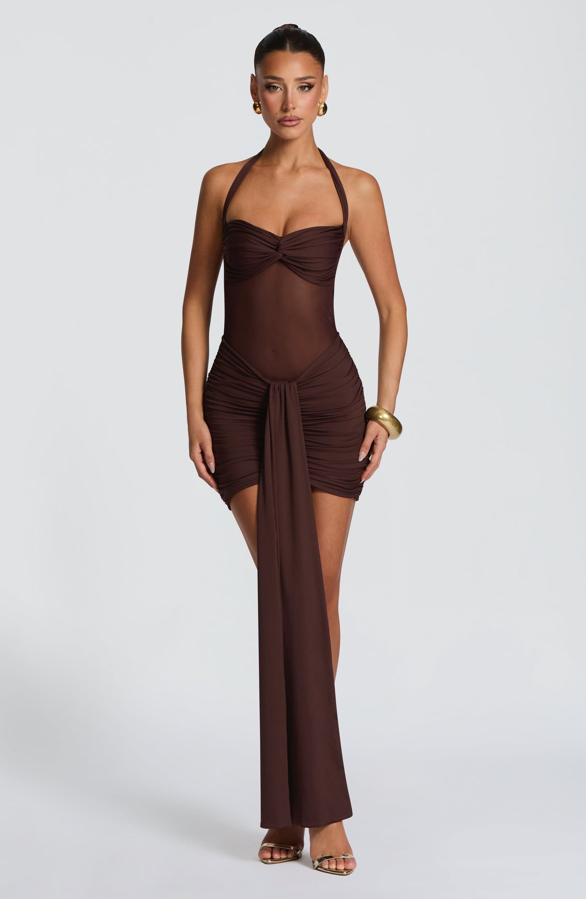 Discover the Vixen Mini Dress in plum brown crafted from stretch slinky jersey and sheer mesh. The sweetheart twist neckline with halter ties frames the shoulders beautifully, while the tightly ruched skirt features a flattering V-shaped waist and dramatic centre drape panel.